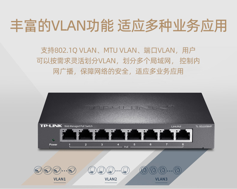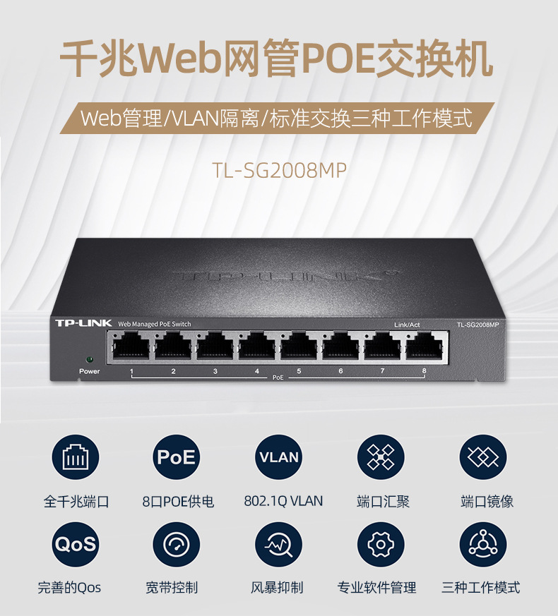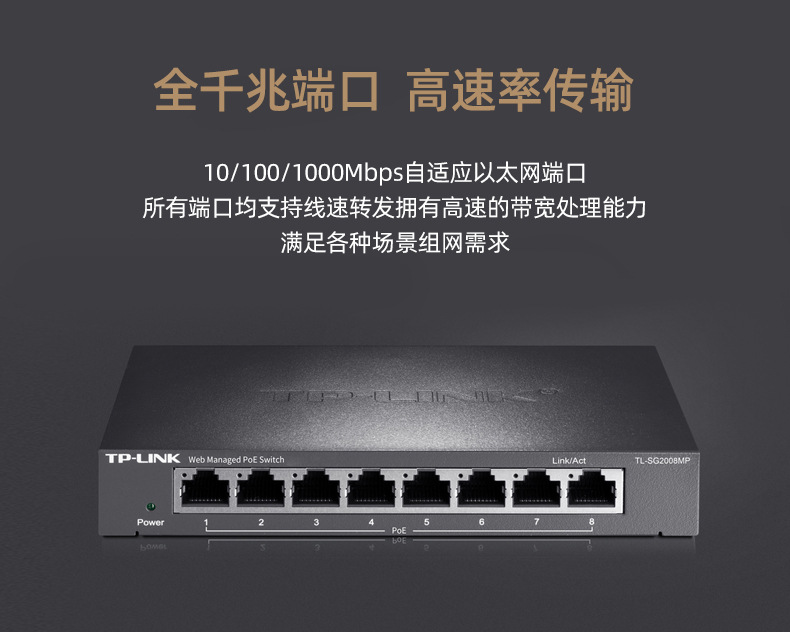 TP-Link全千兆网络交换机TL-SG2008MP云管理企业办公8口POE供电