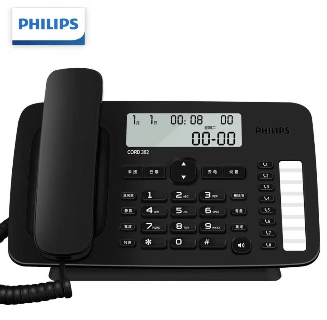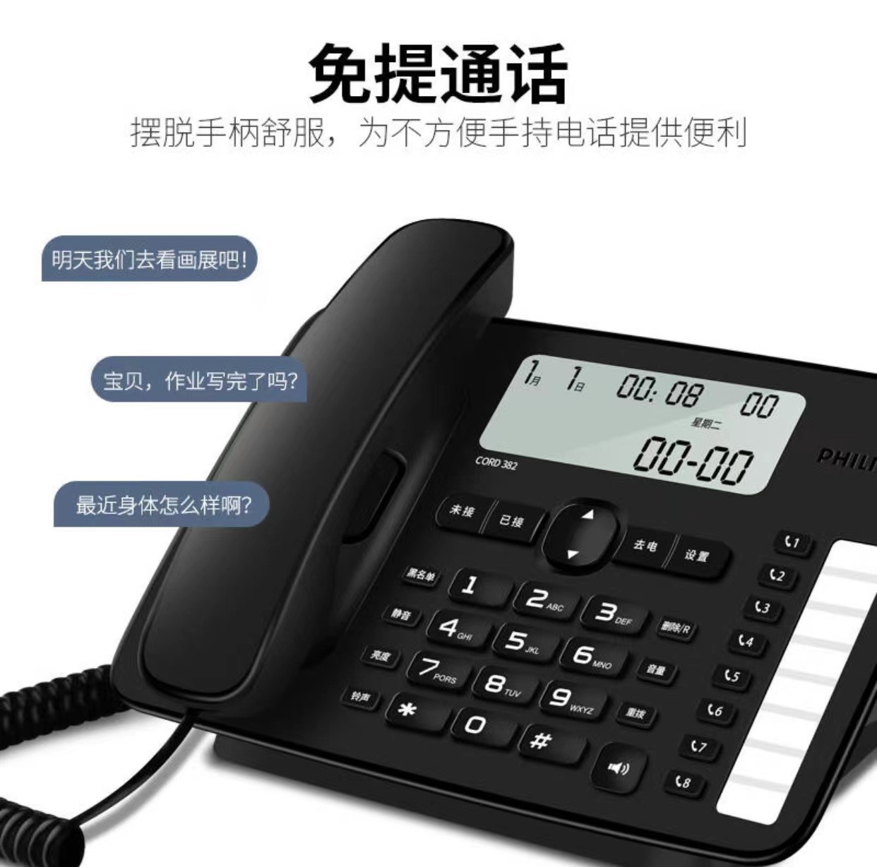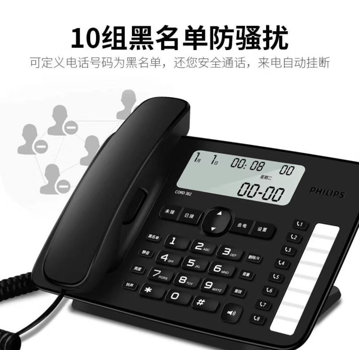 飞利浦CORD382 办公电话机家用黑名单座机一键拨号免提免电池固话