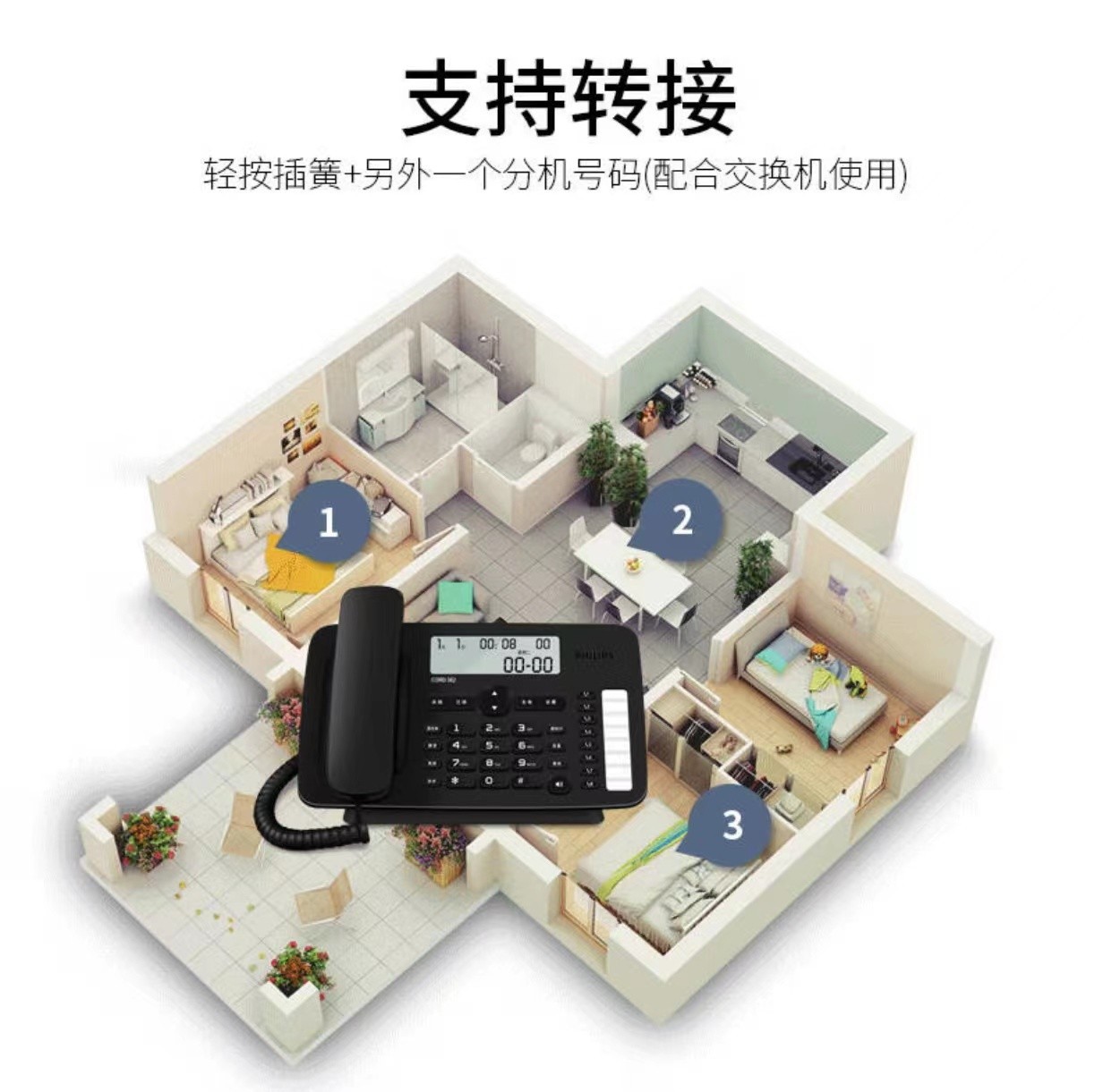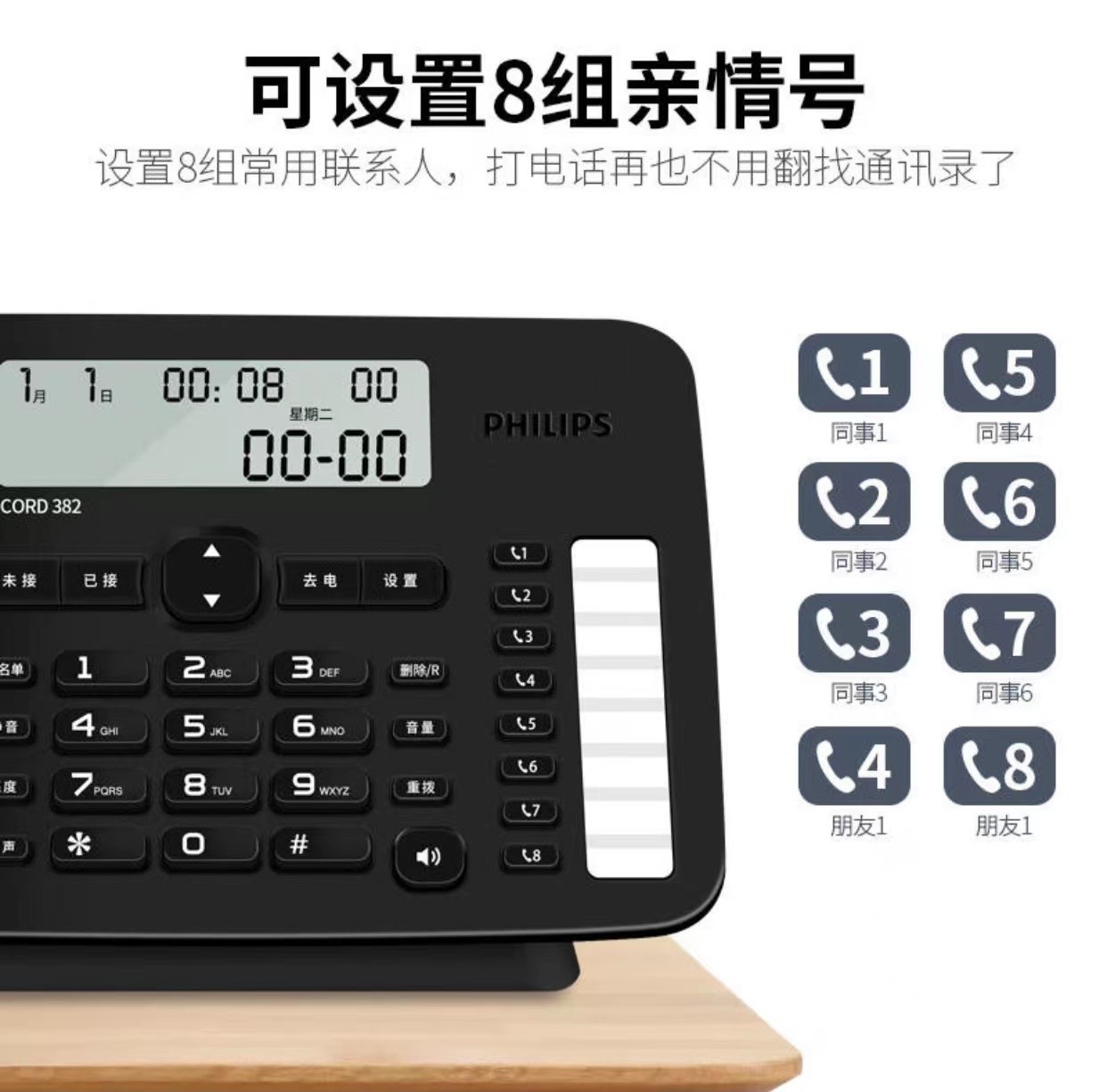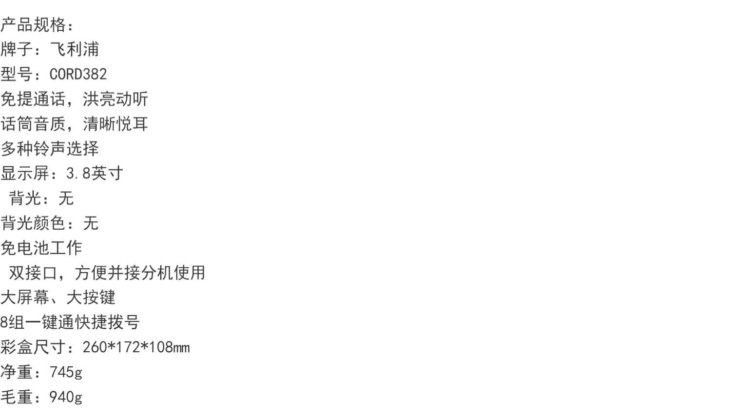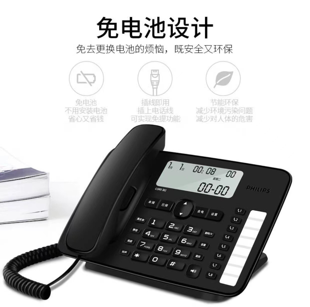 飞利浦CORD382 办公电话机家用黑名单座机一键拨号免提免电池固话