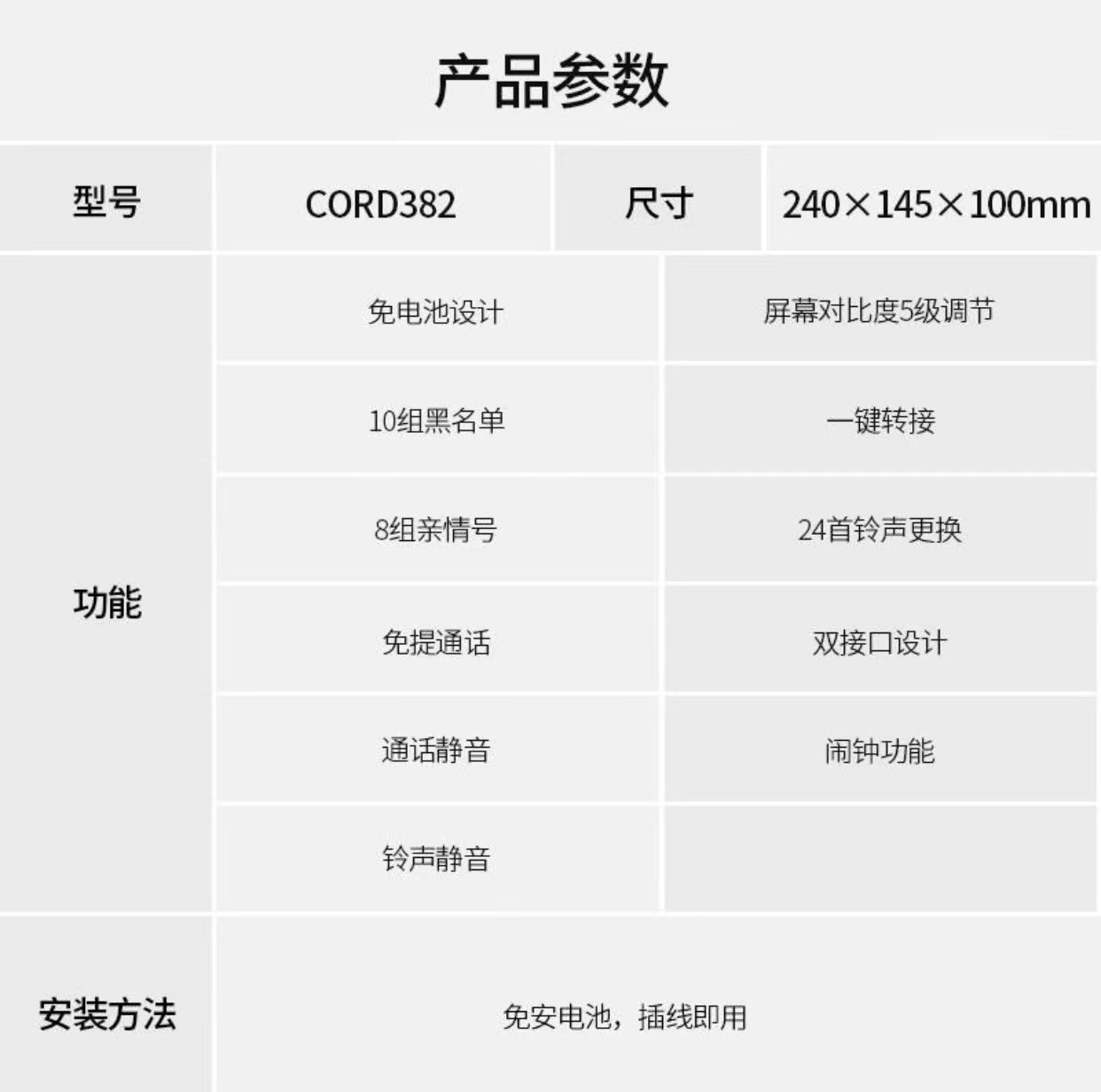 飞利浦CORD382 办公电话机家用黑名单座机一键拨号免提免电池固话